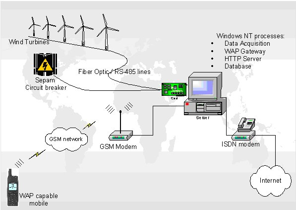 Το πρόγραμμα παρακολούθησης και ελέγχου που αναπτύχθηκε, επικοινωνεί με τον ελεγκτή (controller) της κάθε Α/Γ, μέσω καλωδίου οπτικών ινών και με ξεχωριστό τρόπο ανάλογα την Α/Γ (πρωτόκολλα: Modbus/Jbus, VMP, RS-232/485). Αν χρειαστεί μπορεί να επικοινωνήσει μέσω ειδικού καλωδίου σημάτων και με ανεξάρτητες μετρητικές συσκευές (transducers, ανεμόμετρα, κλπ) που ενδέχεται να εγκατασταθούν σε κάποιο σημείο του Α/Π. Παρόμοια, συνδέεται και ο κεντρικός διακόπτης της μέσης τάσης του Α/Π (Sepam 2000), για την καταγραφή της συνολικής ισχύος. Ο Η/Υ βρίσκεται στον κεντρικό οικίσκο του Α/Π και διαθέτει 2 modem (ένα GSM και ένα γραμμής-ISDN). Η εφαρμογή είναι βασισμένη στην πολυδιεργασία (multiprocessing), ένα από τα βασικά χαρακτηριστικά του λειτουργικού συστήματος Windows ΝΤ, έτσι ώστε η ενδεχόμενη αποτυχία μιας δραστηριότητας (δηλ. μιας σύνδεσης με Α/Γ ή με το internet ή με το GSM δίκτυο) να μην έχει επίπτωση σε μία άλλη δραστηριότητα που εκτελείται ταυτόχρονα. Τα (ταυτόχρονα) δεδομένα από κάθε Α/Γ αποθηκεύονται κάθε 10λεπτά. Η στατιστική τους επεξεργασία γίνεται, επίσης, παράλληλα με την συλλογή των δεδομένων. Τα αποτελέσματα της ανάλυσης καθώς και τα λεπτομερή ανά sec δεδομένα του τελευταίου 10λεπτου (online data) διατίθενται για την παρακολούθηση της λειτουργίας του Α/Π μέσω internet και κινητής τηλεφωνίας. Σημαντικό χαρακτηριστικό του προγράμματος είναι η δυνατότητα εκκίνησης και σταματήματος Α/Γ ή και του Α/Π, είτε τοπικά, είτε μέσω μηνύματος SMS, είτε WAP, φυσικά μετά από μία ασφαλή διαδικασία αναγνώρισης του χρήστη. Οι